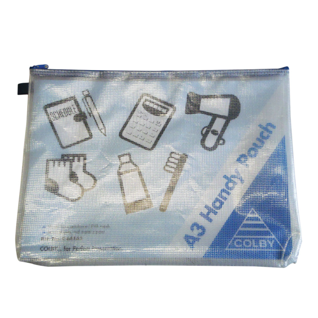 #COLBY GUSSET HANDY POUCH A5. High quality A5 size gusseted zippered pouch, made from water-resistant mesh reinforced PVC, with fabric finger loop and fabric-backed metal zip.Tear proof and water resistant, gusset expands 20mm.Translucent with fabric backed metal zipper. Fabric finger loop. Made from high quality heavy duty EVA with nylon mesh reinforcing. Please note item with descriptions pre-fixed # are special order products and generally available within a few days following receipt of your order. |