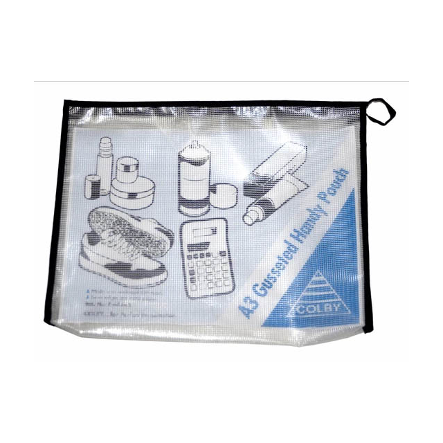 *COLBY HANDY POUCH STANDARD A3 ZIPPERED. Ideal for art kit storage! Nylon mesh reinforced PVC which is water resistant and tear proof. The A3 size is large enough to store A3 sketch pads and is ideal for students to artists - great for carrying supplies into the field. Features cloth finger loop and full length zipper across the top of the pouch. |