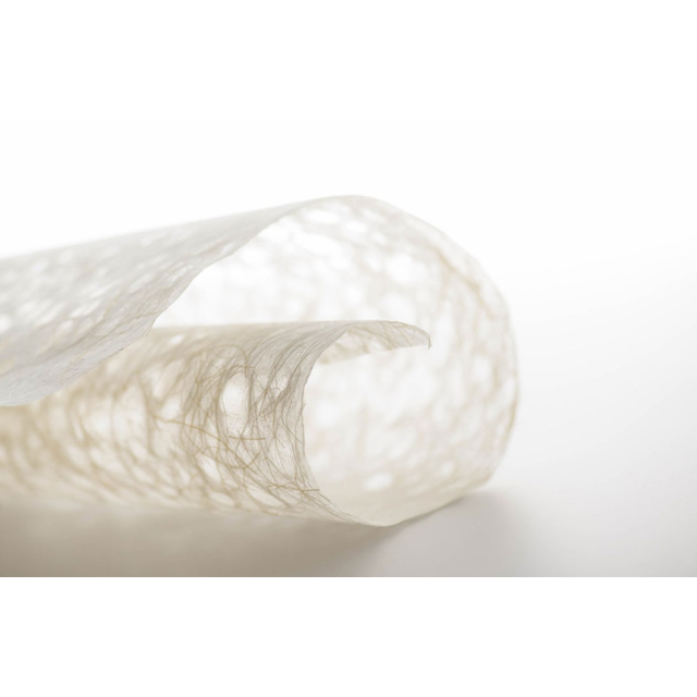 The technique of Rakusui (create gaps on the surface by dropping water) has existed for years. In the manufacture of 27gsm Asarakusui paper, Awagami redefined this method by adding hemp fibres in the paper so that the gaps on the surface are emphasized and crisp. The hemp fibre has natural gloss and the clear gaps give the paper a refreshing and cool effect. By utilizing the transparent aspect, this paper is suitable for making lampshades as well as many other art and craft applications. Can also be used as special purpose wrapping paper.