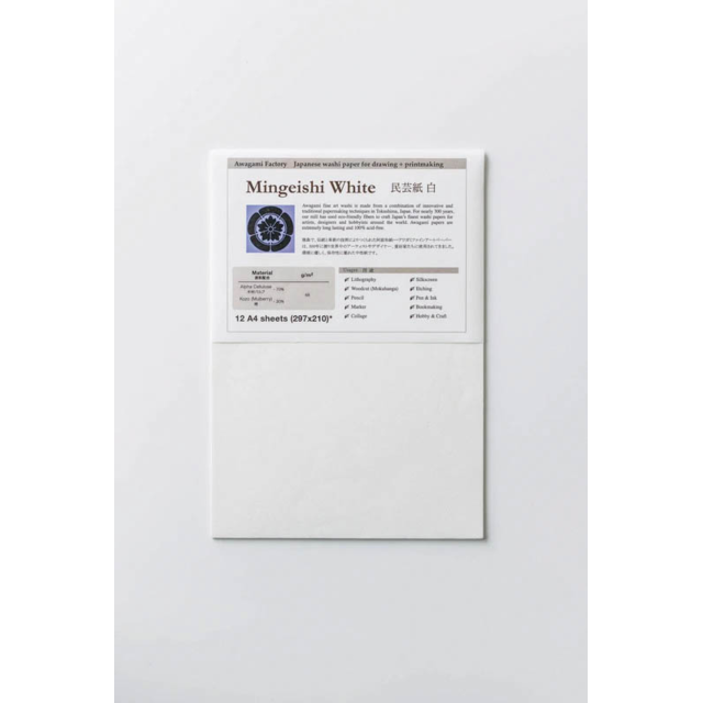 AWAGAMI A4 MINGEISHI WHITE WASHI PAPER PACK OF 12. Mingeishi is manufactured from 70% alpha cellulose plus 30% Kozo fibre (mulberry) and 48 gsm in weight. Although the surface of this paper is fairly soft and the sheet lightweight, this paper exhibits superior overall strength and is highly resilient. Suitable for lithography, etching, mono & block printing, silkscreening, pen and ink, pencil, markers, collage, hobby & craft and bookmaking. |