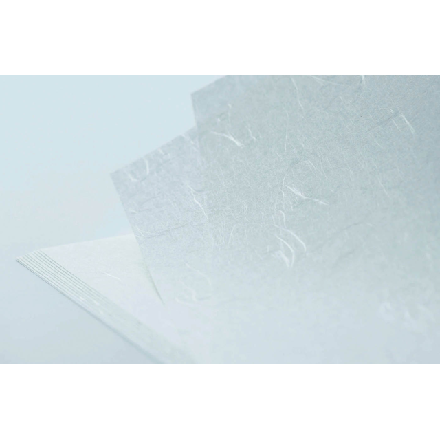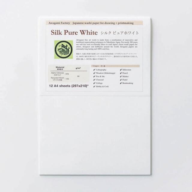 AWAGAMI A4 WASHI PAPER - SILK PURE WHITE 48gsm Pack 12. Silk Pure White is manufactured from 85% alpha cellulose plus 15% recycled washi.An excellent introductory washi paper for budget-conscious students, printmakers and designers. It is a warm white/medium weight paper with two distinct surface textures. Both sides may be used to attain different creative effects. Suitable for lithography, mono & block printing, silkscreening, pen & ink, charcoal, pastels, pencil, markers, collage, hobby & craft and bookmaking. |