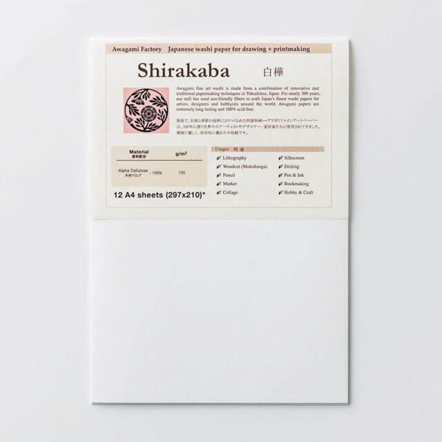 AWAGAMI A4 WASHI PAPER - SHIRAKABA WHITE 100gsm Pack 12. Shirakaba is manufactured from 100% alpha cellulose. This paper is an excellent choice for etching, block printing and mixed-media works. Illustrators will enjoy drawing on the smoother side while printmakers prefer the paper's softer side for its printing and embossing qualities. Suitable for lithography, etching, mono & block printing, silkscreening, pen & ink, pencil, markers, collage, hobby & craft and bookmaking. |