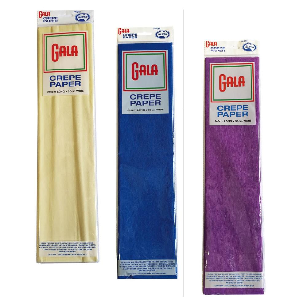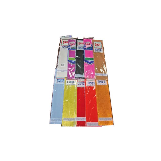 CREPAS12 CREPAS12 CREPE PAPER 50x240cm ASSORTED PACK OF 12 FLAT ROLLS. One roll each of White, Black, Lilac, Pink, Petunia (a darker pink), Orange, Emerald Green, Celestial Blue, French Blue, Canary Yellow, Dark Brown, National Red. In stock Login For Price