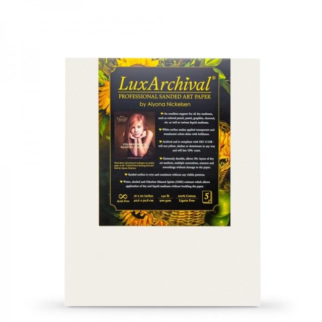 An excellent art surface when using coloured pencils, graphite, charcoal and pastels. This soft white 300gsm, 100% cotton, paper features a smooth and consistent 400 grit surface that makes transparent and translucent colours shine with brilliance. It is acid-free, archival and compliant with ISO.11108 to last 100+ years and will not yellow, darken or deteriorate in any way. This paper will hold 30+ layers of coloured pencil, pastel, charcoal, graphite and will not buckle with the application of alcohol, water or mineral spirit mediums.