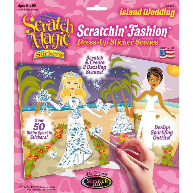 *SCRATCH MAGIC SCRATCHIN FASHION - ISLAND WEDDING. Mix and match clothing and accessory stickers for the latest looks and then scratch, peel and stick dazzling scenery stickers on the large 215 x 235mm backdrops to complete the scene. Each kit contains over 50 Scratch Magic Scratchin Fashion dress-up stickers, 2 dress up models in large picture scenes, 2 picture stand sets, wooden drawing stylus and instuctions. |