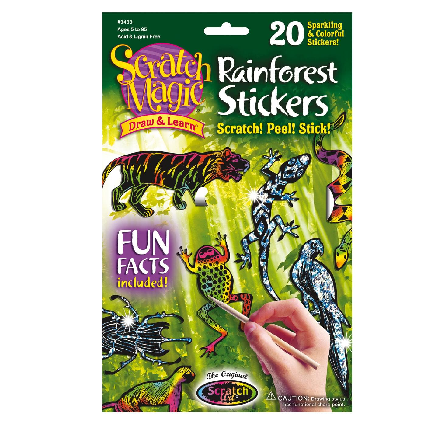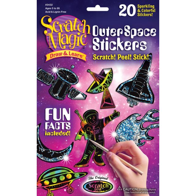 *SCRATCH MAGIC DRAW+LEARN STICKERS-OUTER SPACE. Scratch and create sparkling and colourful stickers of Artic animals while learning about them at the same time. Each sticke rpack contains 20 black-coated multicolour and sparkling holographic sticker shapes, wooden drawing stylus, instrctions and fun facts sheet. |