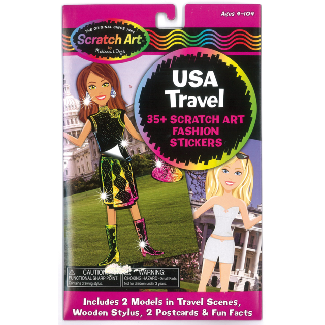 *SCRATCH-MAGIC TRAVELIN FASHION FUN KIT-USA. Scratch and create sparkling outfits in all parts of the world with Scratchin' Fashion Travelling kits. Each kit contains over 35 clothing stickers, wooden drawing stylus, postcards and scenes from the fashion centres of the world - the USA, France, Italy and England. |