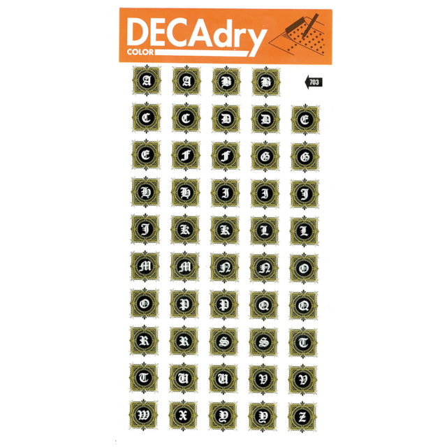 *DECADRY DECOR #703 LETTERS. .This set contains box shapes in gold and black with upper case letters. |