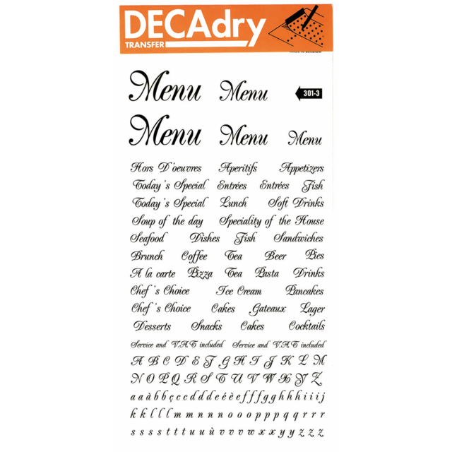 *DECADRY TRANSFER #301 MENU. Contains menu headings plus alphabet in upper and lower case in black. |
