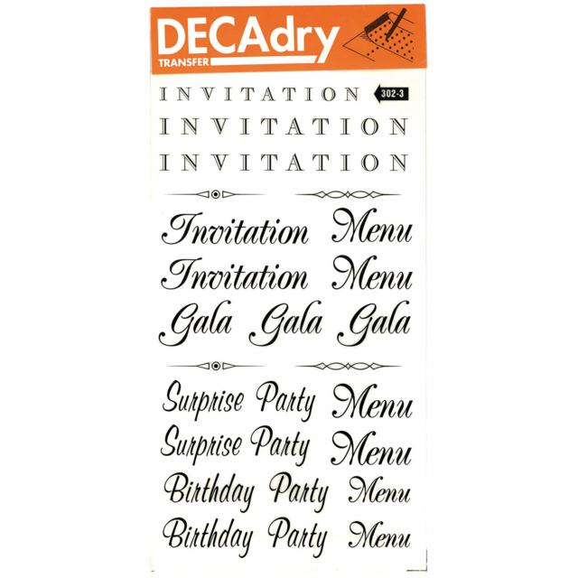 *DECADRY TRANSFER #302 INVITES. Contains invitation,party,gala and menu phrases in black. |