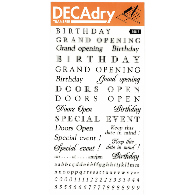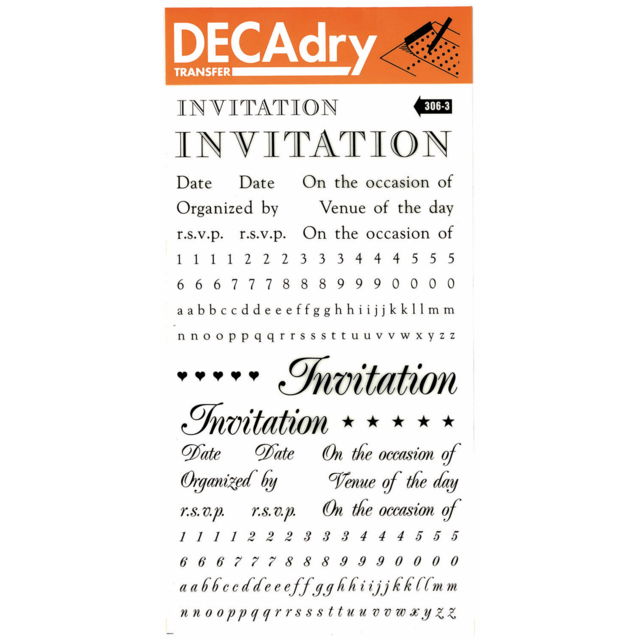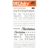 *DECADRY TRANSFER #306 INVITES. Contains invites, dates, letters in lower case and numbers in black. |
