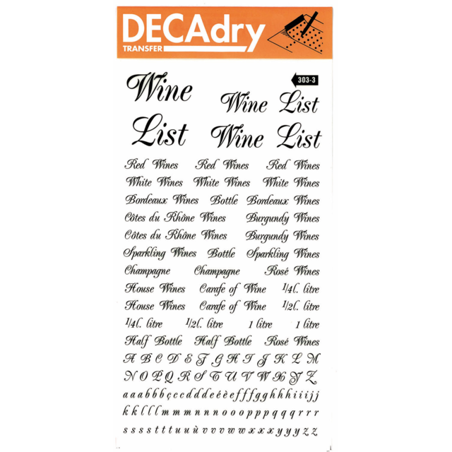 *DECADRY TRANSFER #303 WINES. Contains wine list, alphabet in upper and lower case in black. |