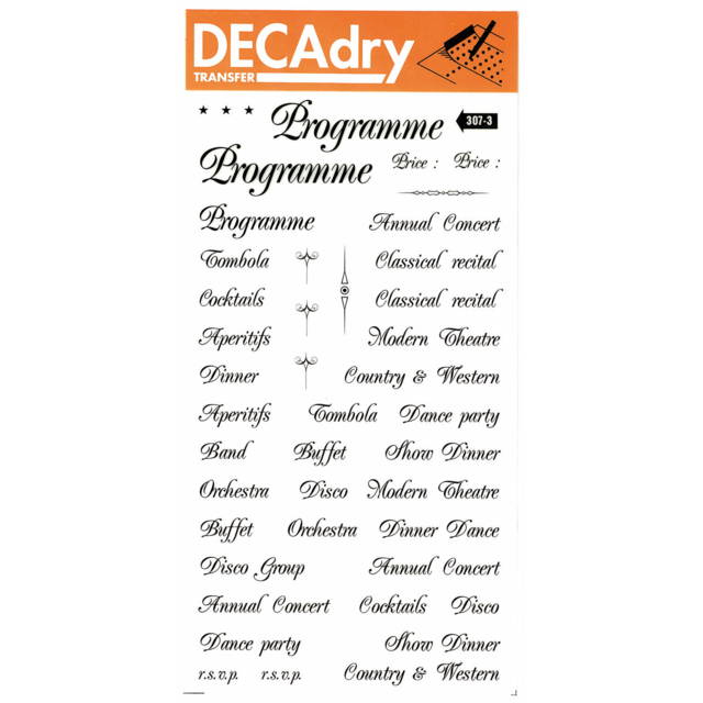 *DECADRY TRANSFER #307 PROGRAM. Contains various programme choices in black. |