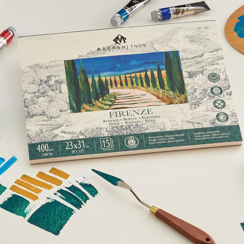 Firenze is a specialised acrylic painting paper. Made on a cylinder mould machine using a traditional process. Its composition of 100% high-quality cotton fibres, its heavy weight, and double sizing (both internal and surface) make it highly absorbent and perfect for painting with acrylic colours. The absence of acids and chlorine derivatives in its processing makes it resistant to UV yellowing, while maintaining the vibrancy of the colours applied and ensuring their long life. It has a textured surface and a natural white appearance. 400gsm.