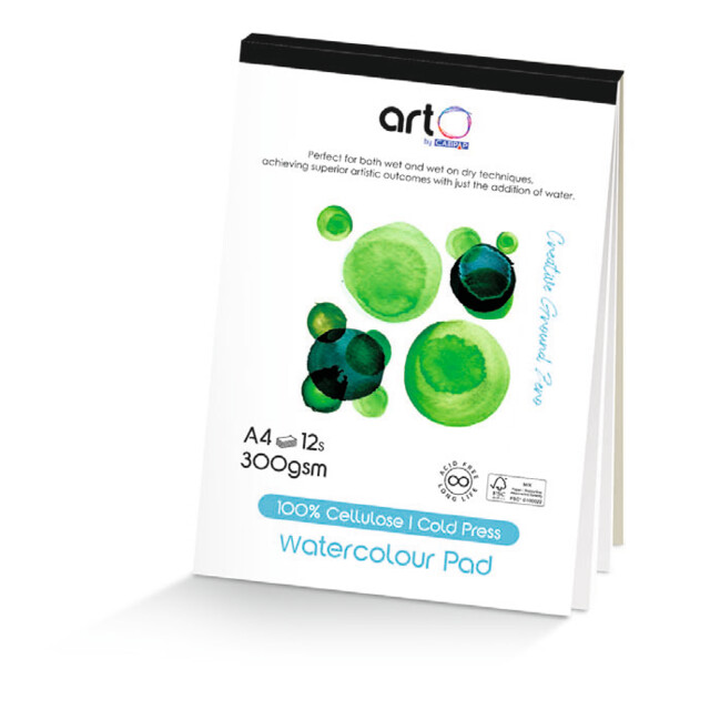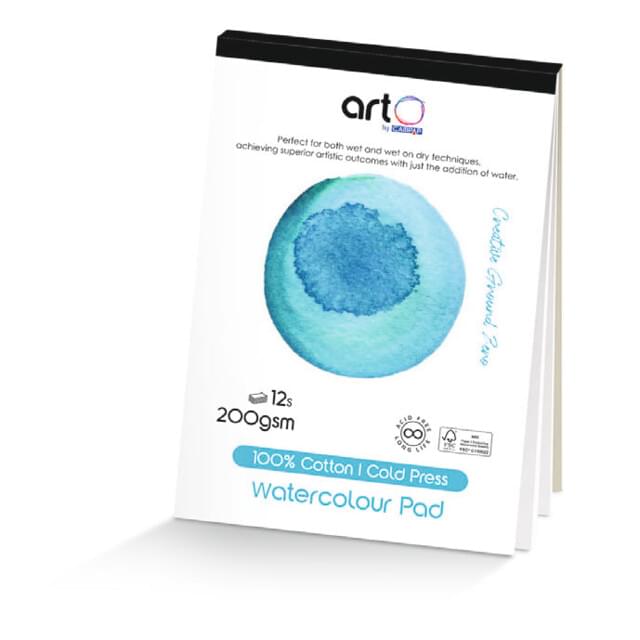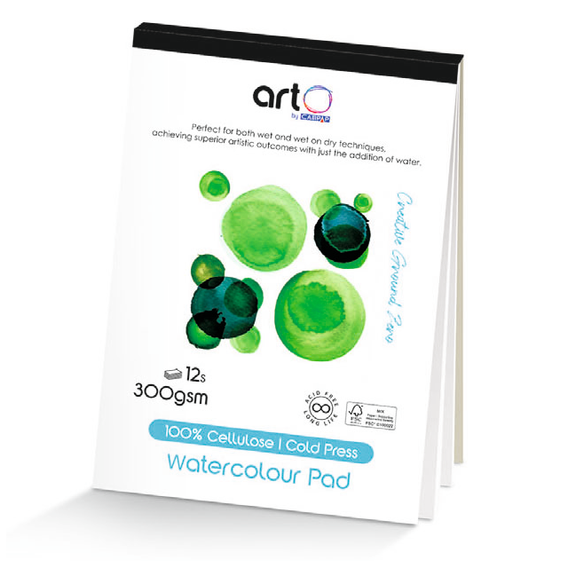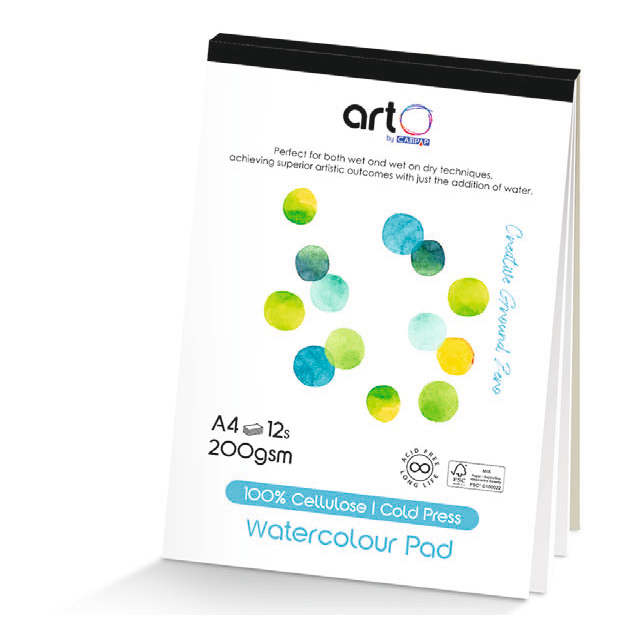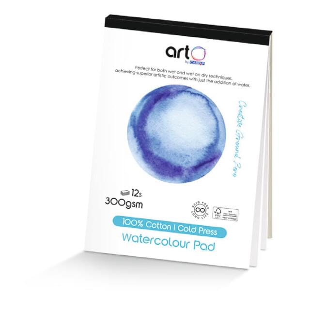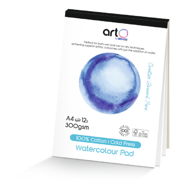 Arto 25% Cotton Watercolour Paper: Arto 25% cotton watercolour paper is made of a mix of 25% cotton and cellulose. It is acid-free, natural white with a cold press surface with internal and external sizing making it very absorbent. This high quality, 300gsm, European-milled paper is perfect for artists, art students and beginners. Ideal for watercolour, gouache, acrylic, ink, charcoal and drawing.