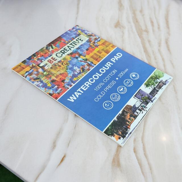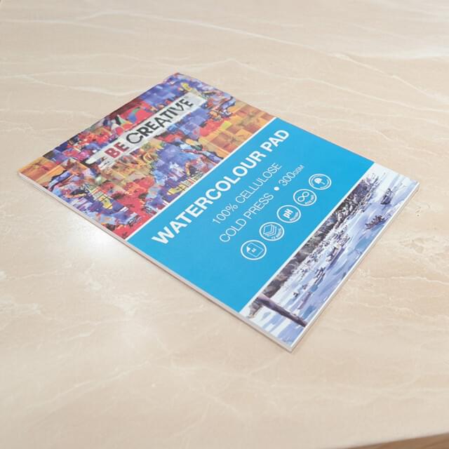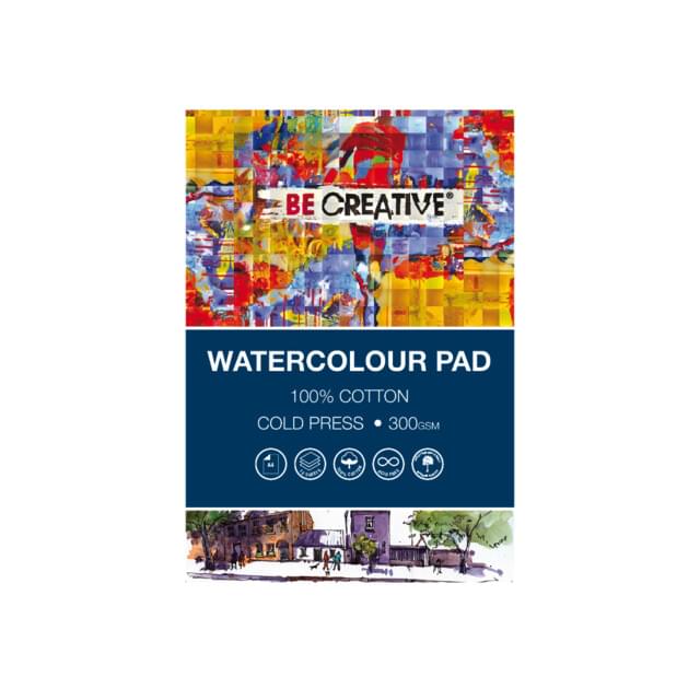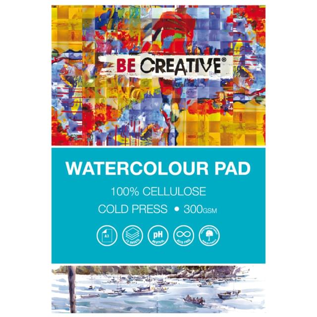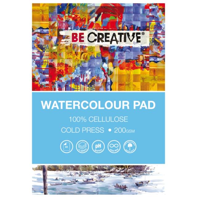 Be Creative Studio Watercolour Pads are manufactured using 100% lignin-free cellulose. This Italian-milled paper is acid-free, pH neutral, absorbent and resistant to aging. It has a medium texture and high wet strength providing the user with nice flow and accurate colour reproduction. Produced with 100% E.C.F pulp, this watercolour paper is available in 200 and 300gsm weights in a cold press finish.