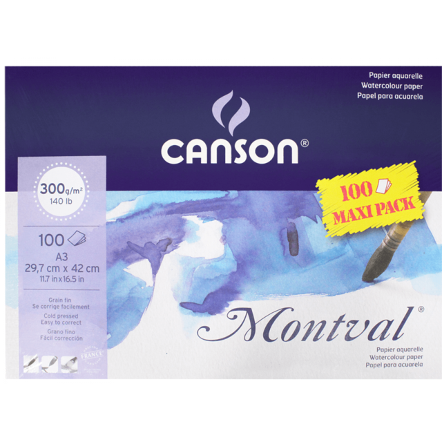 MV300A3P MV300A3P CANSON MONTVAL 100 SHEET 300g WATERCOLOUR PAPER A3 PAD.Contains 100 sheets of 300gsm A3 Cold Pressed cellulose watercolor paper. In stock Login For Price