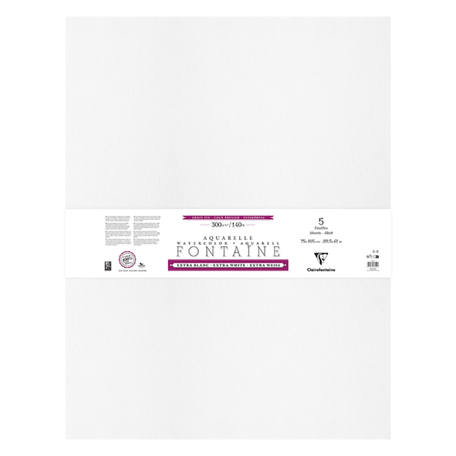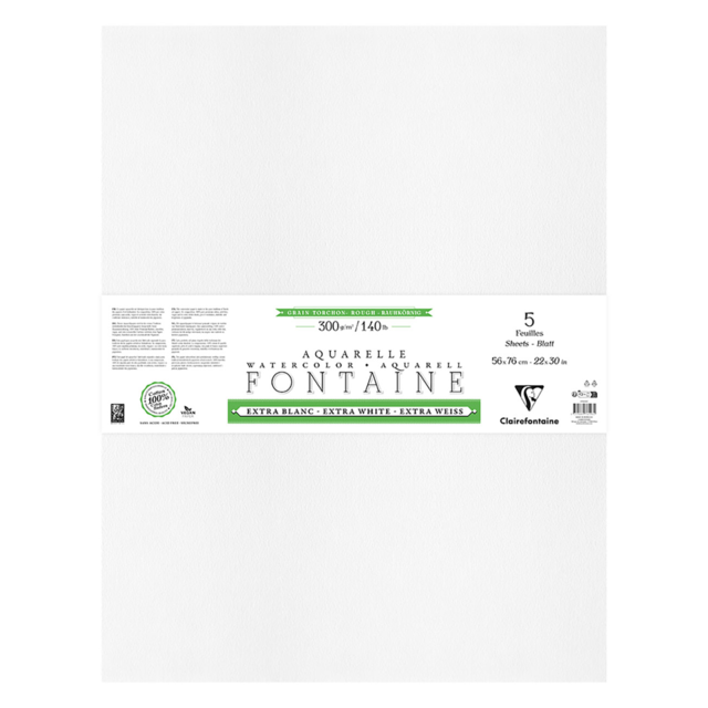 CLAIREFONTAINE FONTAINE EXTRA-WHITE WATERCOLOUR PAPER 300gsm COLD-PRESSED 2 DECKLE EDGES 75x105cm Pack of 5 sheets |
