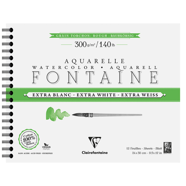 FONTAINE EXTRA-WHITE 300gsm COLD-PRESS SPIRAL WATERCOLOUR PAPER PAD 24x30cm 12 sheets |
