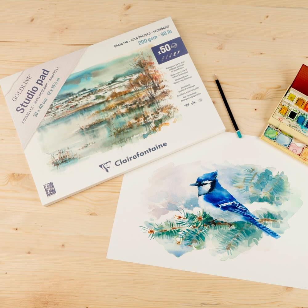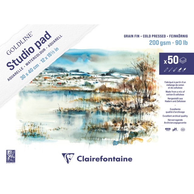 An acid free, archival substrate made from a mix of 25% cotton and 75% lignin free cellulose. The 200gsm paper is cold pressed and both internally and externally sized resulting in a slightly textured, highly absorbent surface which is ideal for creating a different levels of detail. Goldline Studio Watercolour paper is ideal for a variety of media including watercolour, gouache, acrylic, ink, charcoal and pencil.