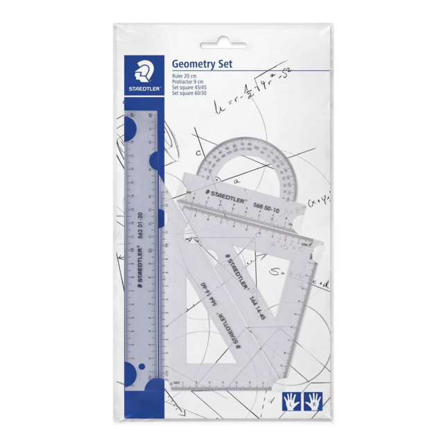 Geometry sets ideal for students at school or home. Clear plastic with bevelled inking edges and metric scale. Supplied in a plastic wallet.
