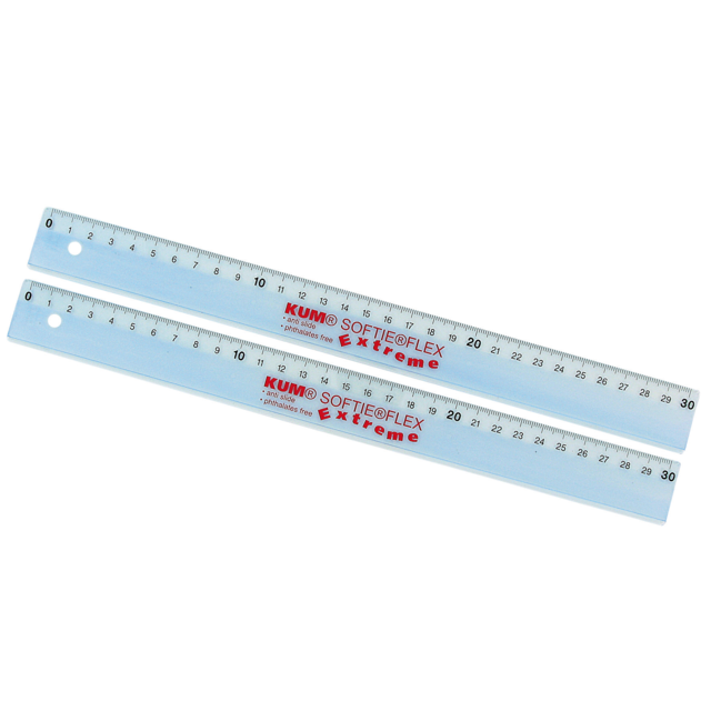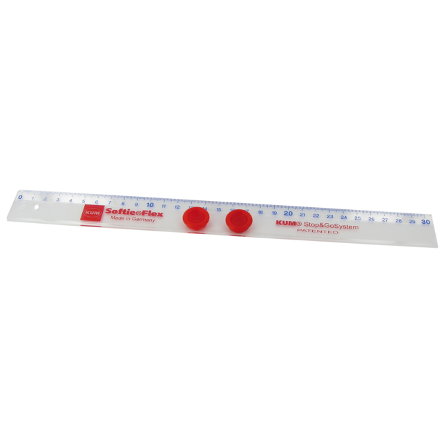 KUM STOP & GO SOFTIE-FLEX 30cm RULER. 30cm ruler with Stop & Go removable grips. The innovative Stop & Go Grips allow a precise fixation of the drawing instrument and thus guarantee millimetre accurate working. Manufactured from an extremely flexible material, free of harmful phthalates. |