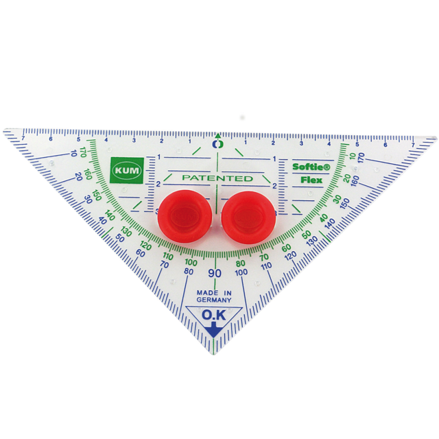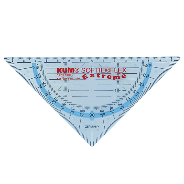 KUM SOFTIE-FLEX 16cm PROTRACTOR. Softie Flex drawing instruments are manufactured with an ultra-modern material making them extremely flexible and breakproof. 16cm triangle protractor with smudge rests. |