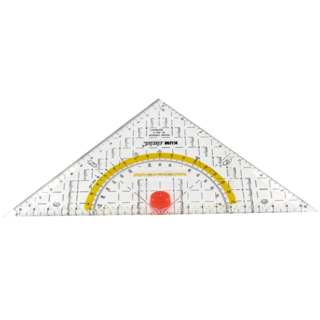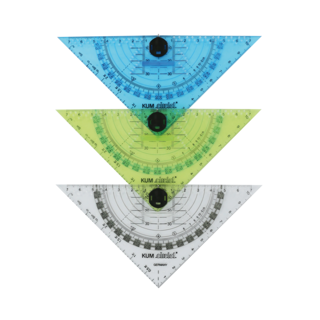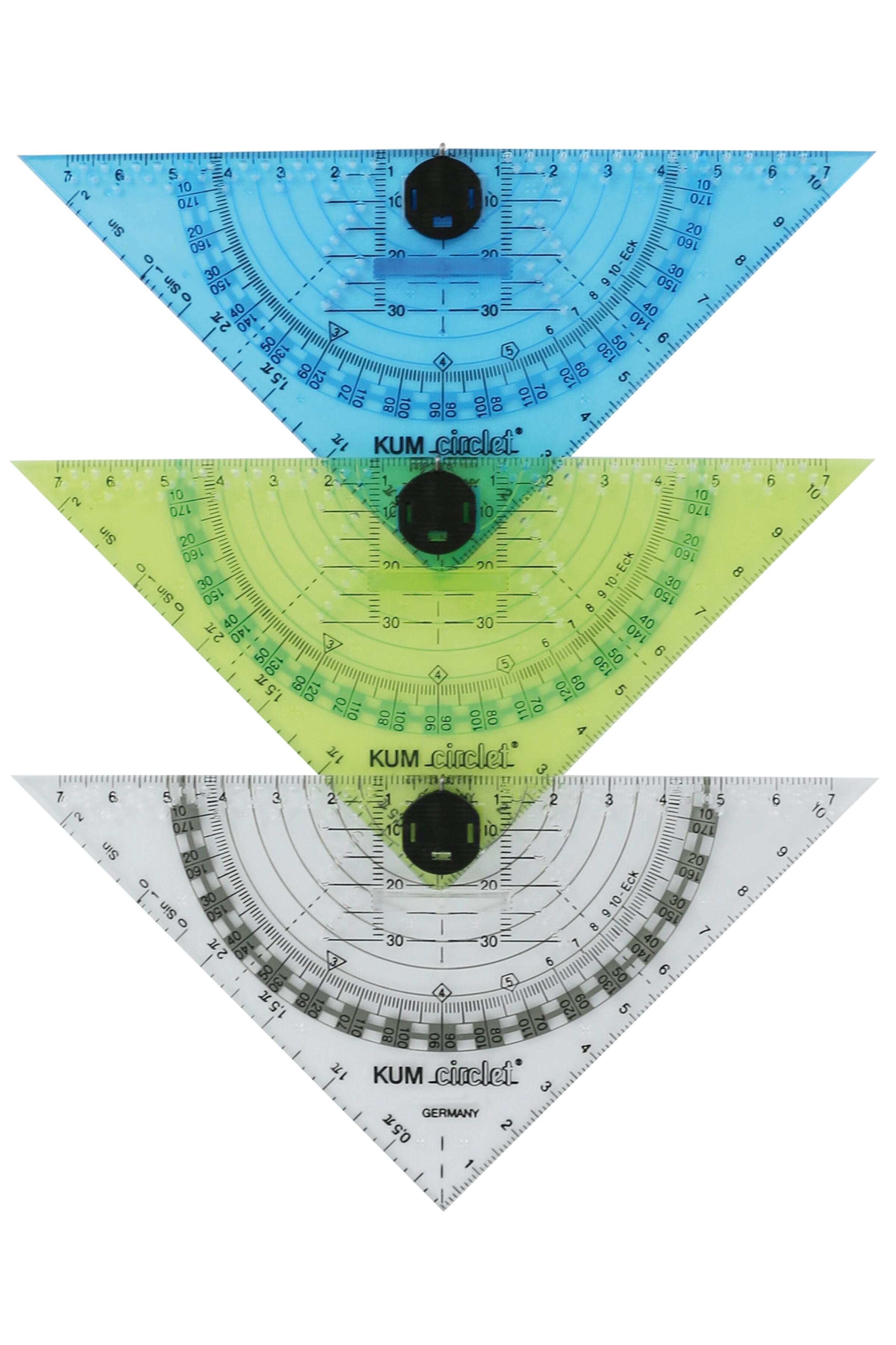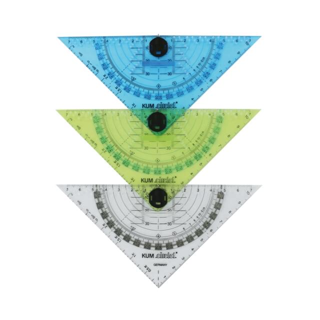 KUM 493C TB 22cm GRIP TRIANGLE PROTRACTOR. Compass-triangle protractor with finger grip and anti-smudge rests. Students can draw angles and directed edges, circles and analogies with the single drawing instrument. |