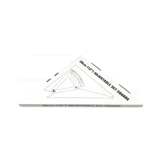 ADJUSTABLE SET SQUARE 30cm. Acrylic adjustable Set Square with bevelled and inking edge. Measurements in degrees, slope and rise. |