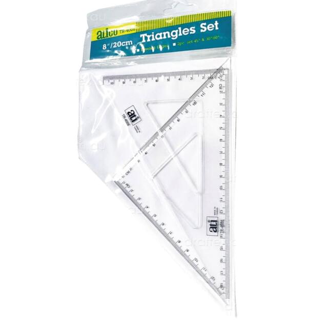 PLASTIC SET SQUARE SET No 8 - 20cm. Set of 2 includes 1 x 45 degree and 1 x 60/30 degree set square. Graduations start at corner and extend to end. Slight bevel to graduated edge and may be inverted for ruling with markers or Ink. |