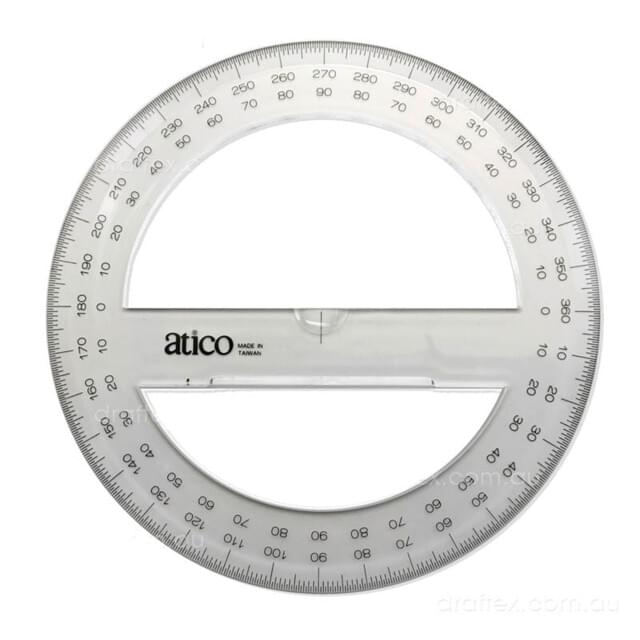 PLASTIC PROTRACTOR 15cm - 360 degree. Clear plastic protractor with increments in black for easy reading. |