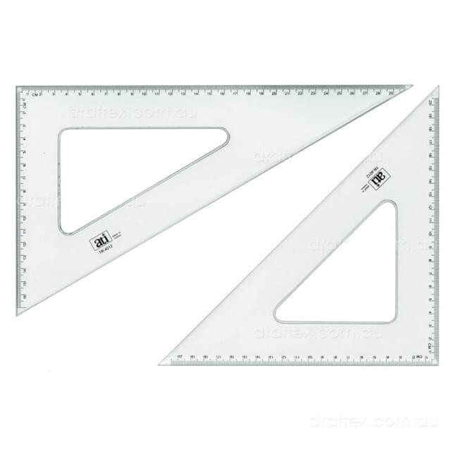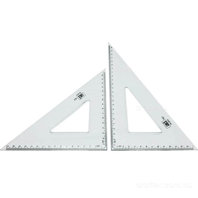 PLASTIC SET SQUARE SET No.12 - 30cm. Set of 2 includes 1 x 45 degree and 1 x 60/30 degree set square. Graduations start at corner and extend to end. Slight bevel to graduated edge and may be inverted for ruling with Markers or Ink. |