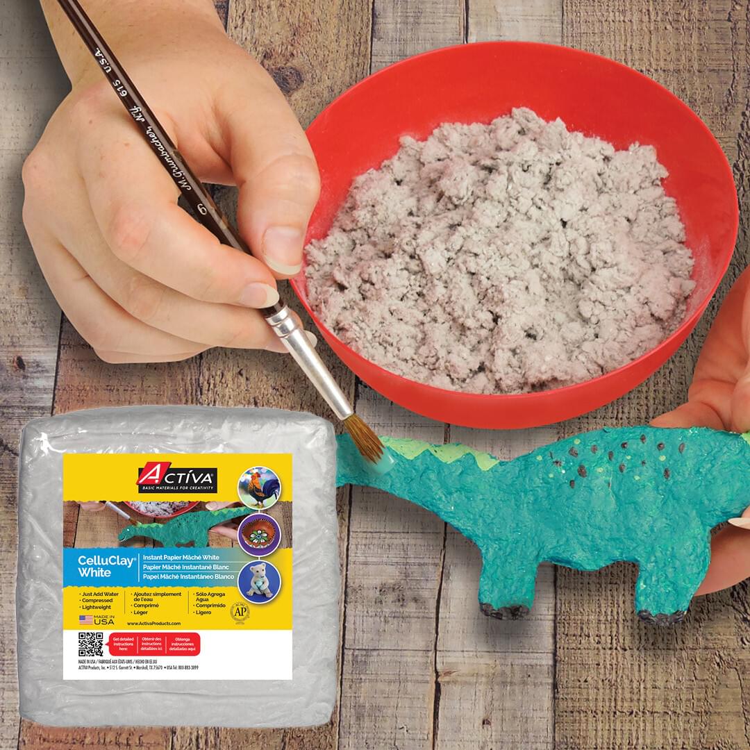 CelluClay Instant Paper Mache is a unique, compressed, and ready-to-activate papier mâché medium. No need to fuss with newspaper strips, glue and spending hours building up layers. CelluClay's super fine and versatile form makes it the artist preferred medium for sculpting, texturing and modeling projects. Simply add water, mix and apply to virtually limitless applications. Air dry or bake in the oven to expedite drying. Finish as desired (sand, saw, drill, paint, glaze, etc)