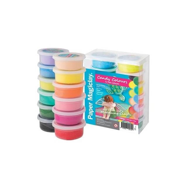 PAPER MAGICLAY CANDY COLOURS SET 12. Contains a 20 gram tub each of Magiclay in the 12 bright colours of peach, yellow, orange, dusty pink, hot pink, red, lilac, blue, lime, turquoise, green and black in a plastic storage tube. |