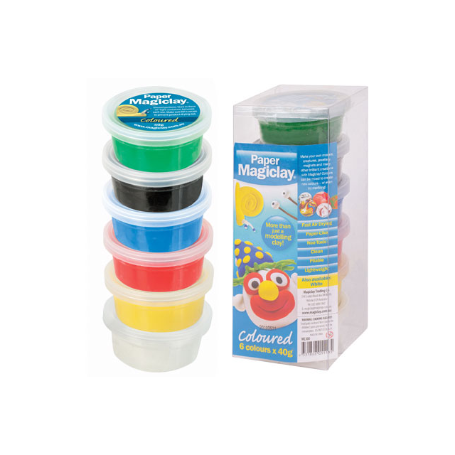 PAPER MAGICLAY BASIC STARTER SET 6x40gTUBS, Contains one 40g resealable tub each of: black, blue, green, red , white and yellow in a plastic storage tube. |