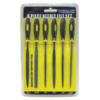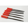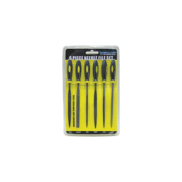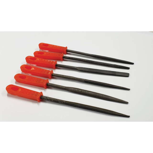NEEDLE FILE SET OF 6 WITH PLASTIC HANDLES. Needle files manufactured from hardened and tempered steel. They can be used on all types of stone, steel, glass, ceramic tiles, plastic and fibreglass. The set contains 1 each of a flat, round, square, triangular, round and round flat file. |