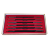 PRECISION SOAPSTONE 6 PIECE FILE SET. These plastic-handled files have very small teeth which make them suitable for precision work or for preparing the stone surface before using sandpaper and for polishing.They are suitable for shaping stones that measure up to hardness 2 on the Mohs hardness scale including Alabaster, Serpentine and especially suitable for greasy type stone such as Soapstone. |
