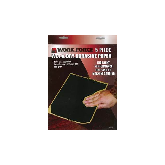 WETand DRY SANDPAPER ASSORTED-Pack5. A water proof, resin-bonded, silicon carbide paper ideal for achieving extremely smooth surfaces. Contains 1 sheet each of grades 240, 320, 400, 600 and 800 grit |
