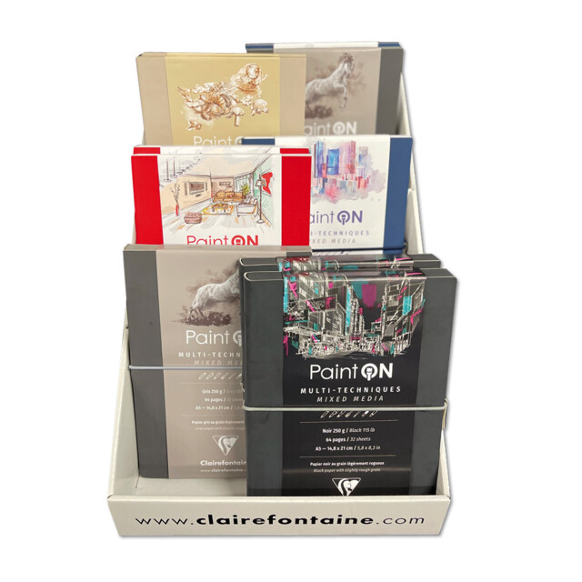 CLAIREFONTAINE A5 SEWN PAINT'ON BOOK COUNTER DISPLAY.Display includes 2 x A5 books each featuring the following papers: Extra White, Grained, Natural, Grey and Black |