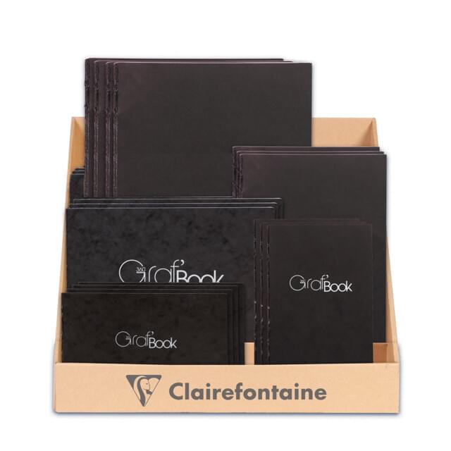 CLAIREFONTAINE GRAF'BOOK 360 COUNTER DISPLAY. Display includes 5 books each in the sizes of 11x17cm, 15x21cm 32.5x32.5cm square, A6, A5 and A4. Display measures 32.5cmL x 32.5cmW x 25cmH |
