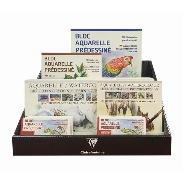 CLAIREFONTAINE ETIVAL FULL WATERCOLOUR LEARNING PAD DISPLAY. Display includes 6 each of the following styled pads:- Horse Related 21x21cm square- Flowers A4 portrait & landscape- Horse Related A4 portrait & landscape- Macaroons - various A4 portrait & landscape images- Cityscapes 10x15cmplus 5 each of the following larger pads for more advanced artists:- Botanical 24x30cm- Animals 30x40cmDisplay measures 49cmL x 42.5cmW x 29.5cmH. |
