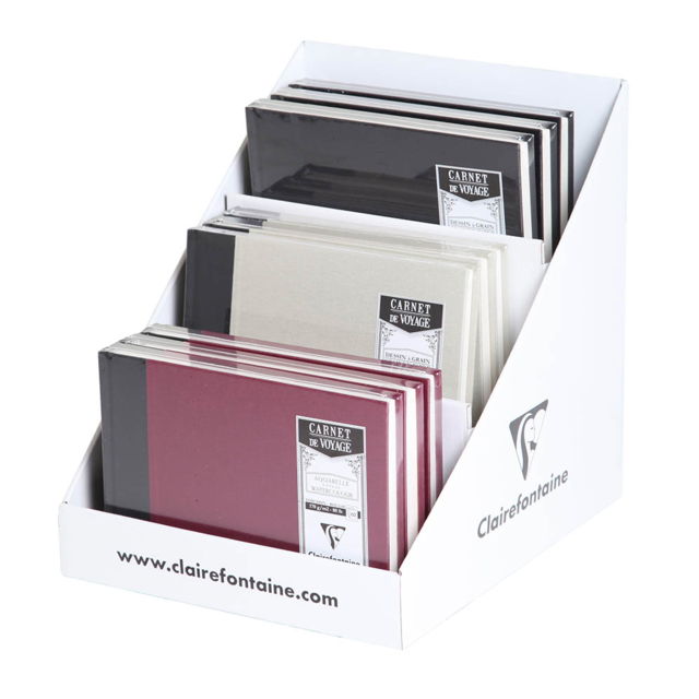 CLAIREFONTAINE A5 CANVAS TRAVEL ALBUM COUNTER DISPLAY.Display includes 4 albums each of Red canvas-covered watercolour albums plus grained drawing paper canvas-covered albums in Grey and Black. |