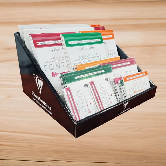 Small (45x45x30cm) cardboard counter display containing Fontaine Traditional White watercolour pads in Cold Press, Hot Press and Rough finishes. Display contains: 2 x A3 pads each in Hot Press & Cold Press, 1 x A3 Pad in Rough, 3 x A4 pads each in Hot Press, Cold Press & Rough, 1 x 18x24cm spiral pad each in Cold Press & Rough, 1 x 19x26cm spiral pad in Hot Press, 1 x 12x18cm spiral pad each in Cold Press & Rough, 1 x 12x18cm glued pad in Hot Press, 1 x 10x15cm Postcard Block in Cold Press plus one A5 pack (25 sheets) each of Hot Press and Cold Press Traditional White Fontaine watercolour paper. |