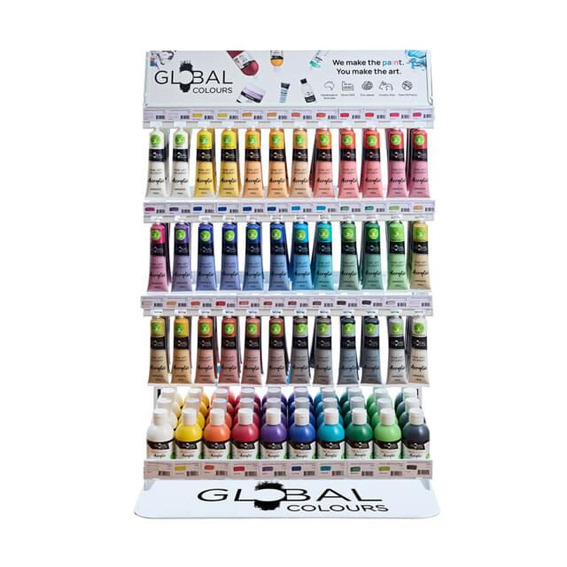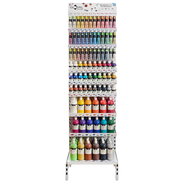 #GLOBAL STUDENT ACRYLIC COUNTERTOP/SHELF DISPLAY. Display contains 5 x 75ml tube each of every colour with an additional 5 x75ml tube each in the best-selling colours - Black, Cool Blue, Cool Red, Cool Yellow, Warm Blue, Warm Red, Warm Yellow and White plus 4 x 250ml bottles each in Black, Cool Blue, Cool Red, Cool Yellow, Green Deep, Green Light, Orange, Purple, Turquoise and White. Dimensions: 100cm high x 60cm wide x 32cm deep. |