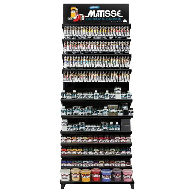 MATSTAND MATSTAND MATISSE STRUCTURE DISPLAY. Display contains 5 x 75ml tubes each in the whole range (475 tubes), 3 x 250ml tubs in Titanium White, 1 x 250ml tub each in 39 of the best-selling colours, 2 x 250ml tubs each of Drying Retarder, Impasto medium, Gel medium, Polymer Matt Varnish, Polymer Gloss Varnish, Spreader medium, Acrylic Painting medium, Gesso, Clear Sealer, Fabric Fixative, Iridescent medium, Brush & hand Cleaner and Watercolour Grounds.Image is for display purposes only and does not represent the stock listed. Available soon Login For Price