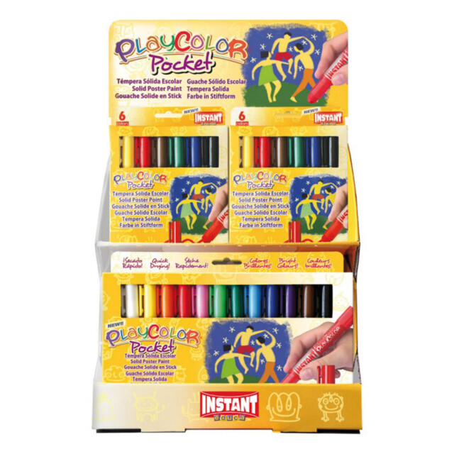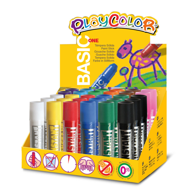 PLAYCOLOR KIDS POSTER PAINT STICK DISPLAY. Contains 3 x 10gm sticks each in white, yellow, red, mid blue, green and black plus 2 x 10gm sticks each brown, purple, sky blue, light green, pink & orange. |