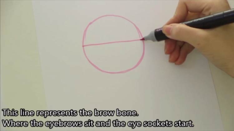It's important you get the proportions right. To do this, find the halfway point on your vertical guideline and draw a horizontal guideline across the width of the head. This will be your eye line.