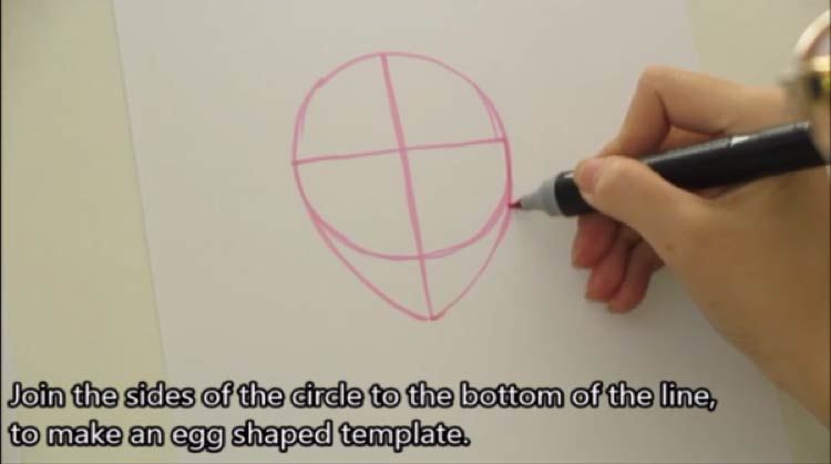 Down the middle, faintly draw a downwards line from the top of the circle and ending below it by about half another circle’s length. This will act as the guideline for your characters chin.