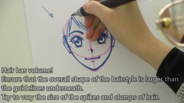 The hair lies outside of the circle guideline you drew in step one. This gives the hair a more realistic, believable look. Whether it’s long and sleek or short and spiky, divide it into sections and outline those rather than trying to draw every strand of hair.